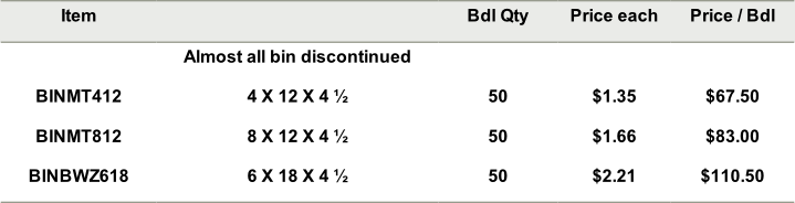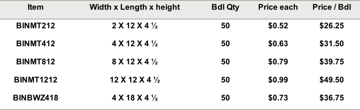 Use for organized storage of parts on standard shelf depths.  Rigid, self-locking construction.  Until ready for use they store flat.  All dimensions are inside dimensions.  We sell bundles only. We do not stock these.